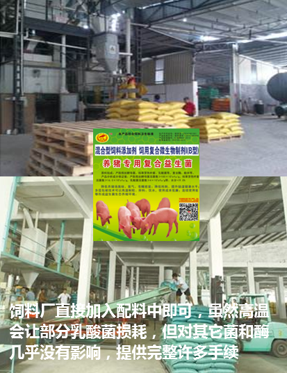6.飼料廠如何加入益生菌?答:飼料廠可以生產(chǎn)包含益生菌的全價(jià)飼料進(jìn)行商品銷(xiāo)售;規(guī)模豬場(chǎng)的客戶(hù)還可以將益生菌產(chǎn)品交給飼料廠,委托加入自己就不需要添加了(產(chǎn)品所需資質(zhì)等材料由我們提供);工廠如果是制作的是粉料,直接加入即可;如果需要高溫制粒,“養(yǎng)豬專(zhuān)用復(fù)合益生菌”是可以耐高溫制粒的,直接加入制粒即可,目前已經(jīng)十幾個(gè)集團(tuán)公司飼料廠以及上百個(gè)養(yǎng)殖場(chǎng)委托飼料廠加入使用,效果一樣很好,主要得益于“養(yǎng)豬專(zhuān)用復(fù)合益生菌”對(duì)乳酸菌采用多達(dá)5層的包埋(包被)技術(shù)。