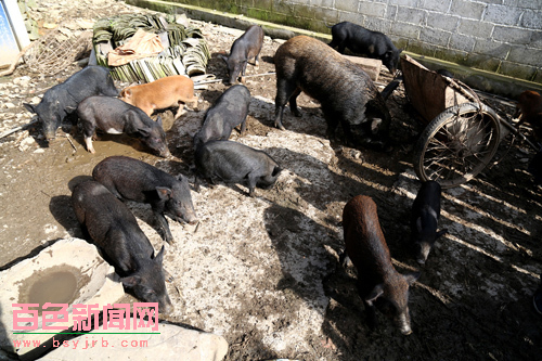 談及野豬種源何處來,李桂蓮說是在山上撿來的。原來,兩年前的一天,她和丈夫上山勞動,看見一只野豬從雜草叢中竄出來,待這只野豬跑開后,夫妻倆來到草叢中發現野豬窩里有一只剛生下的野豬崽,想到家里的母豬也正好產仔,他們就把這只野豬仔抱回家里和家豬仔一起進行母乳喂養,待這只小野豬長成和本地的能繁母豬成功交配產仔,他們就在自家的荒山林地,修起圈舍開始了野豬飼養,2年多來他們已掌握了野豬的習性和飼養技術。野豬疾病很少,平常只在少量精飼料中使用了少量的益生菌和食鹽等微量元素,欄舍沒有臭味,沒發生過大病。