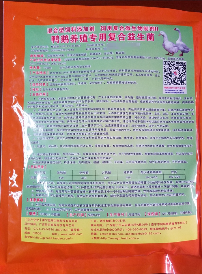 本品是專門針對鴨鵝的生理特性而設計的復合益生菌,特別是針對鴨鵝消化系統的特點,采用適合水禽特性的益生菌結合復合酶制劑的技術,從而能夠達到滿意的使用效果。本品使用簡單、適口性好,具有使用劑量小、成本低廉、安全、無毒,無副作用等特點。