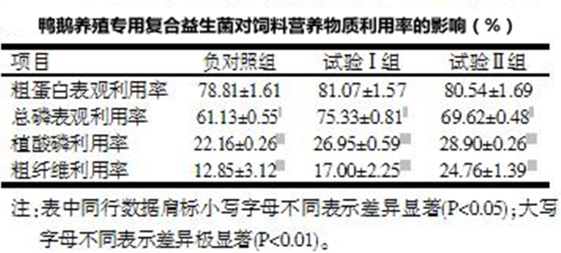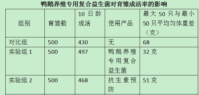 進行鴨拉稀預防試驗證明,可有效地預防鴨拉稀,減少死亡,顯著提高育雛鴨存活率(存活率達到97.0%-98.1%)。在雛飼鴨料中添加鴨鵝養殖專用復合益生菌,結果試驗組較對照組飼料報酬提高11.2%,死淘率下降5..8%。在雛鴨日糧中添加后,結果平均日增重提高24.4%。