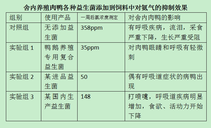 在肉鴨日糧中添加鴨鵝養殖專用復合益生菌結果發現,具有提高日增重,改善飼料轉化率及降低死亡率的效果。一組試驗表明可使肉鴨增重提高14.1%,料重比下降7.6%。鴨血液球蛋白水平提高,血氨減少,鴨的抗病力增強。可極顯著地促進肉鴨對日糧蛋白質的利用,可提高肉鴨早期生長速度和飼料率。