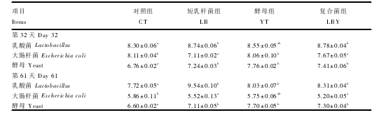 分別于試驗(yàn)的第32和61天,每個(gè)重復(fù)隨機(jī)選擇2頭豬采集新鮮糞樣,用于測(cè)定糞中乳酸菌和大腸桿菌的數(shù)量,菌群數(shù)量以每克糞便中所含細(xì)菌群落總數(shù)的對(duì)數(shù)[[1g (CFU/g)」表示。乳酸菌、大腸桿菌和酵母分別采用改良M RS培養(yǎng)基、伊紅