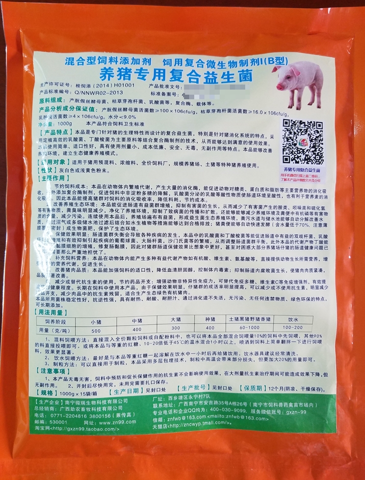 ② 運輸、保存使用方便可靠:養豬專用復合益生菌采用粉劑包裝,采用現代多層包埋技術,可以在常溫下保存;并且可以用于飼料廠高溫制粒(膨化飼料除外,膨化飼料需要在出口處噴涂),這是大部分人所沒有掌握的技術;還可以直接混料飼喂與激活干濕料飼喂。